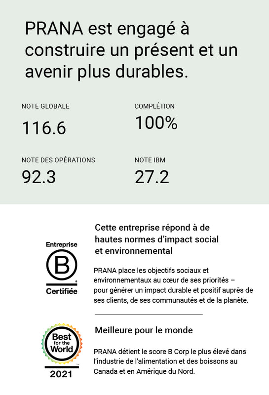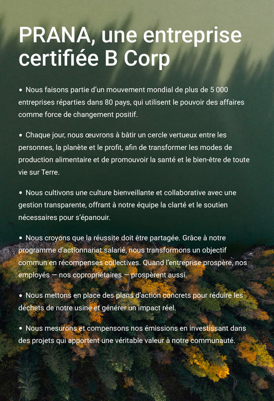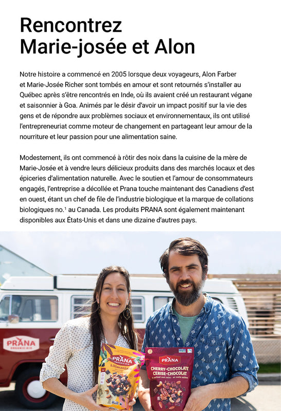 Nous sommes Prana, une entreprise familiale animée par la mission de créer des aliments délicieux, meilleurs à la fois pour vous et la planète. La majorité de nos produits sont bios, d'autres sont naturels.